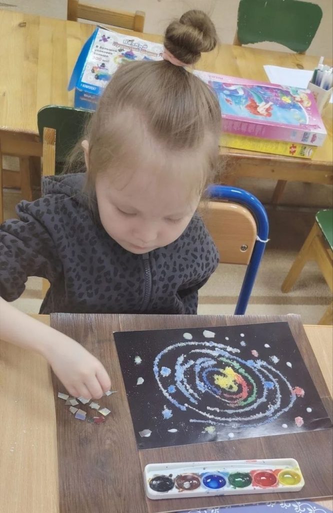 Каждый ребенок создал свою картину из пластилина: ракеты, планеты, звезды и кометы. Разминали, катали жгутики, прищипывали мелкие детали — такой массаж активных зон ладошек необходим для запуска новых нейронных связей и подготовки руки к письму.