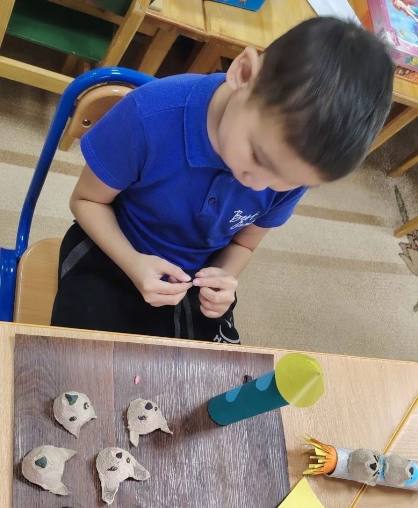 Мастерили настоящий космический корабль из картонной втулки, а легендарных собак-космонавтов — из ячеек яичного лотка. Работали с ножницами, вырезали, приклеивали мелкие детали (глазки, носики). Это отличное упражнение для пинцетного захвата и согласованности работы обеих рук.