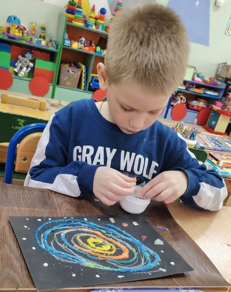 Создавали настоящий космос на бумаге! Наносили клей на контур, сверху сыпали соль, а потом аккуратно раскрашивали яркими красками. Пальчики распределяли соль и смешивали цвета — получилась объёмная и волшебная Галактика. Развиваем тактильные ощущения и творческое мышление.