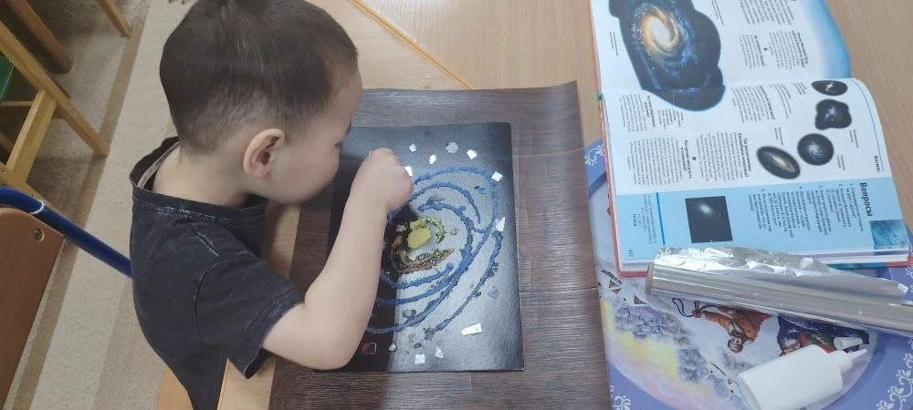 Итогом нашей космической недели стала выставка, посвященная Дню космонавтики. На ней представлены все работы, которые ребята создавали вместе с нами. Особое место занимает картина по мотивам любимого мультфильма «Маленький принц» — она выполнена в технике скрапбукинга. Здесь переплелись разные фактуры: нежные акварельные краски, стабилизированный мох, кусочки ткани, клей и даже синтепон, из которого получились пушистые облака. Каждый элемент дети трогали, подбирали и приклеивали своими пальчиками, развивая сенсорное восприятие и фантазию.